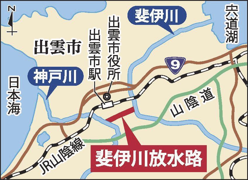 斐伊川放水路は、国の斐伊川・神戸川治水事業で上流の尾原、志津見ダム、下流の大橋川改修と並ぶ3点セットの一つ。斐伊川の増水時に流量の一部を神戸川に流す役割がある。 (松本直也)