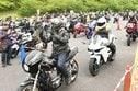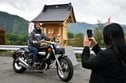 神社前には午前11時過ぎから、エンジン音をとどろかせて個人や団体のライダーが次々と集まった。順番に神社前に愛車を並べ、記念写真を撮ったり、道中のスポットについて話したりして交流を深めた。
