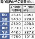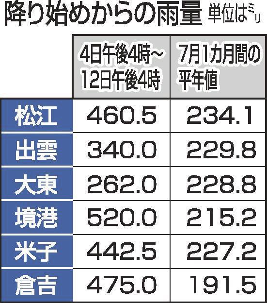 降り始めの4日午後4時から12日午後4時までの雨量は境港で520・0ミリ、倉吉で475・0ミリとなり、7月全体の平年値の2倍超を観測。松江は460・5ミリ、大東(雲南市)は262・0ミリに達した。
