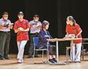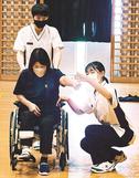 生徒は3人一組のチームになり、事前に出された共通の課題に対し、ステージ上で7分間取り組んだ。「要介護度2の87歳女性」「手のしびれがある」「ひ孫へのプレゼントを考えている」といった細かい設定の利用者役に適切で安全な支援ができているか、審査を受けた。