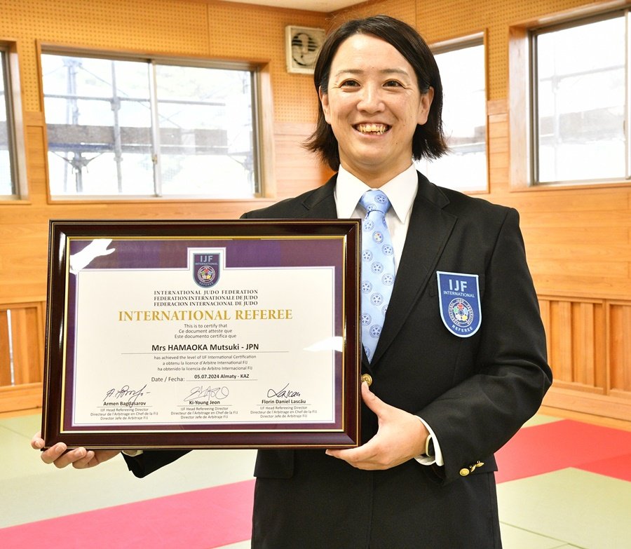 浜岡さんは、県女子柔道選手権9連覇を果たすなど選手として活躍後、結婚・出産を機に2012年に引退。教職、柔道部や地域クラブでの指導の傍ら、14年に全日本柔道連盟(全柔連)のAライセンス審判員資格、17年に五輪や世界選手権などを除いた国際大会を裁けるIJFコンチネンタル審判員を取得し、国内外の大会で審判員を務めている。