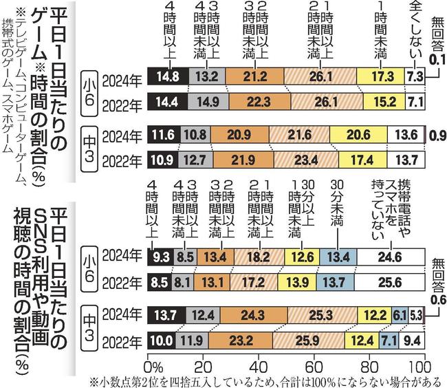 全国でゲームを平日1日当たり4時間以上する小学生の平均正答率は国語57・6%、算数52・1%で、「全くしない」という児童より国語で19・2ポイント、算数で21・9ポイント低かった。スマホやゲームの時間と学力に相関関係がみられた。