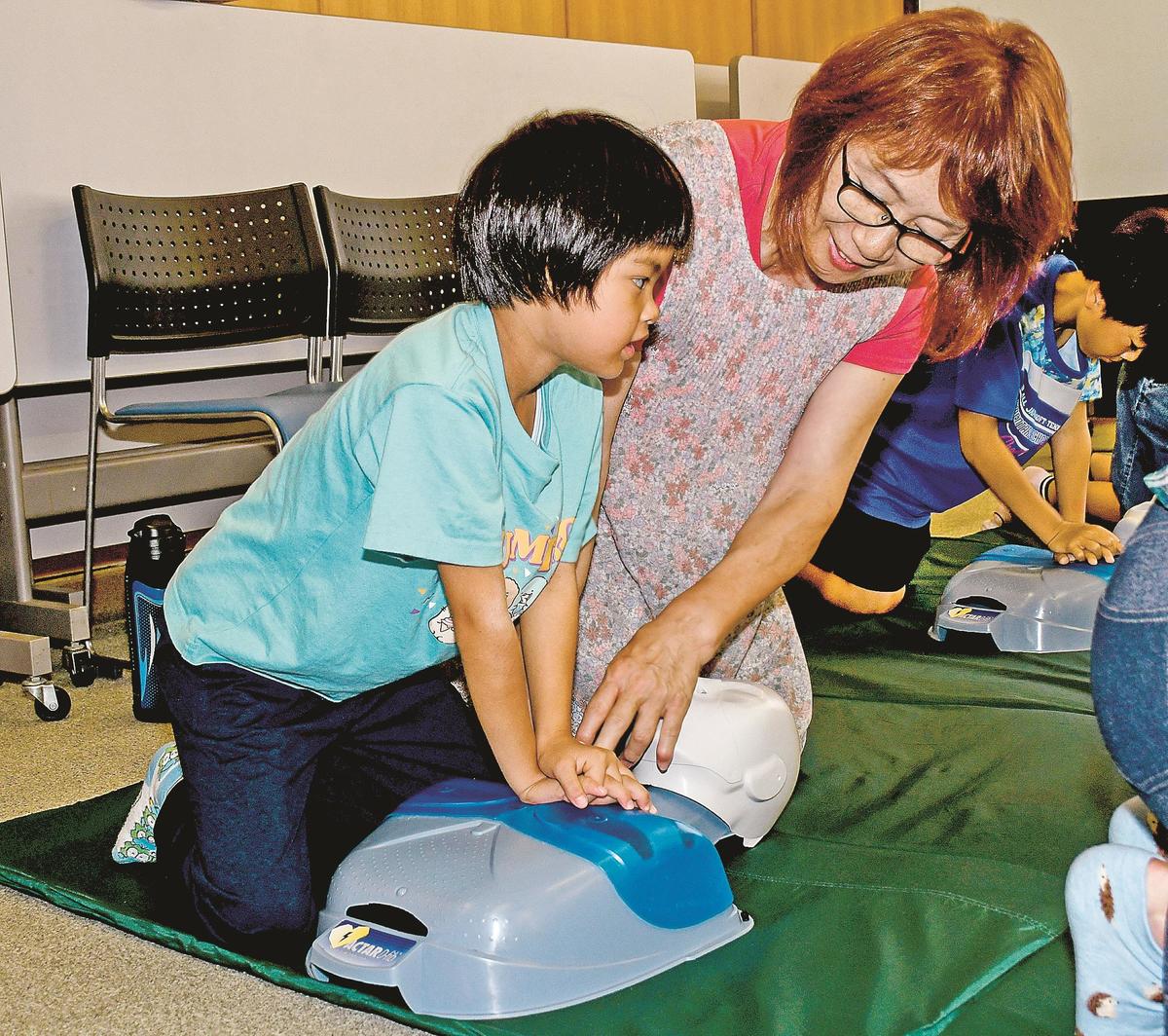 阿須那小学校3年、日高颯人さん(8)は「人の助け方がよく分かった。夏休みなので自分も遊ぶ時は気を付ける」と話した。講習は阿須那公民館が住民の安全意識向上のために毎年開催している。(吉野仁士)