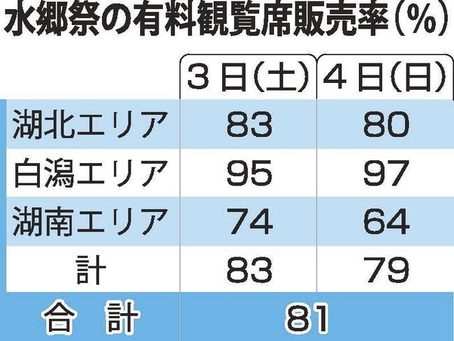 中高生向けの千円からVIP用の10万円まで、33種類を用意した有料席は、3日が83%、4日が79%に上った。1人当たりの料金が安い湖北、白潟エリアで販売数が伸びた。席種別の販売数も集計中としている。