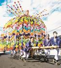 神事花は田儀地区の住民が毎年10月19日、多伎藝(たきき)神社に五穀豊穣(ほうじょう)を願って奉納する。「花馬(はなんば)」と呼ばれ、直径約6メートル。江戸期に由来し、1960年代に一時、後継者不足で途絶えたが、72年に保存会が発足して復活させた。当初、50周年記念行事は2022年に予定していたが、コロナ禍のため、今年開いた。