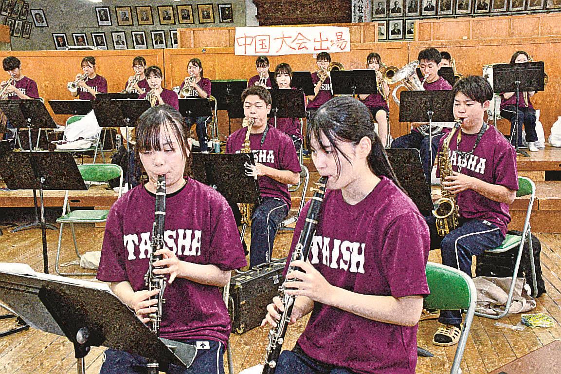 第106回全国高校野球選手権大会の2回戦を控える大社ナインを応援しようと、大社高校(出雲市大社町北荒木)吹奏楽部が14日、全体練習をした。初戦はコンクール出場と重なって駆け付けられず、甲子園のアルプススタンドでの演奏は初めてとなる。音楽でナインを鼓舞しようと気合を入れた。