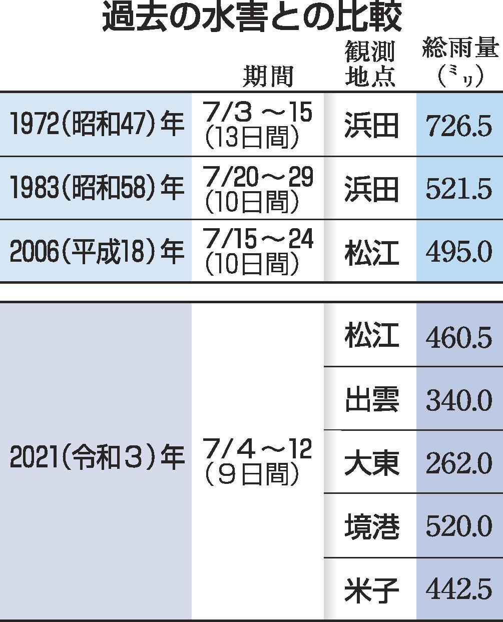 島根県東部から鳥取県中部にかけて積乱雲が連続発生する「線状降水帯」が形成された今回の豪雨は、大橋川が氾濫するなど松江市中心部が浸水し、出雲市などで死者・行方不明者が出た2006年7月水害と大差ない降水量だった。松江市では06年は10日間で495・0ミリ降ったのに対し、今回は9日間で460・5ミリを記録した。