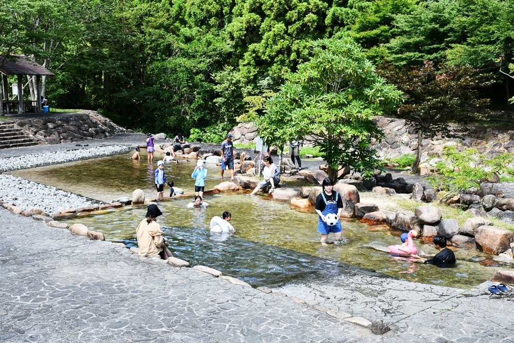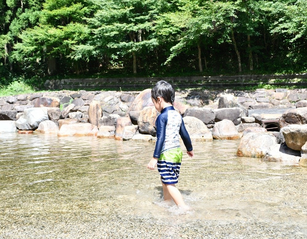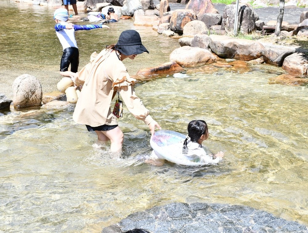 プールなのに温かい? それは、温泉水を引き込んでいるから。森や川が近く、山あいの豊かな自然を感じられる立地も魅力だ。にぎやかなセミの鳴き声はどこか懐かしさを感じさせてくれる。目いっぱい水遊びを楽しもう。