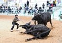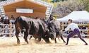 牛が負けを覚えると闘志が出なくなることを避けるため、頃合いを見て引き分けにする取組が6番続いた後、メインイベントの横綱牛の勝負では、原田地区の「上風だるま」(4歳、750キロ)と五箇地区の「仁王1号」(4歳、820キロ)が対戦した。双方が力で押し合う膠着(こうちゃく)状態が続き、40分にわたる大相撲の末、最後は仁王1号が押し切り勝利した。