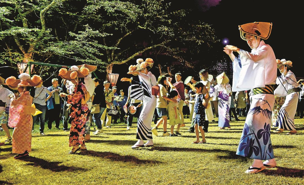 鳥取県江府町の伝統の夏祭り「江尾十七夜」が17日、コロナ禍と火災を乗り越え5年ぶりに通常開催された。祭りのハイライトで県指定無形民俗文化財「こだいぢ踊り」では、そろいの浴衣と編みがさをかぶった保存会メンバーや飛び入り参加の観客が太鼓と唄に合わせしっとりと踊った。