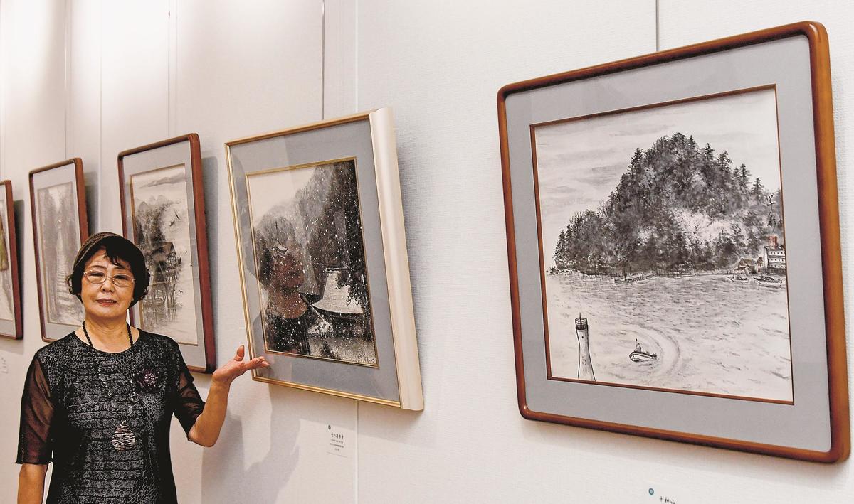 安来市在住の水墨画家・内田洋彩さん(81)の作品展が22日、同市安来町の和鋼博物館市民ギャラリーで始まった。山陰両県の景色を中心に墨の濃淡で表現された35点が来場者を魅了している。