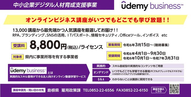 島根県は、DXに向けた従業員の教育やリスキリングを推進する県内企業、個人事業主を支援するため「学び続ける人材」=「自立型学習人材」の育成のためのオンライン学習講座を提供しています。後期先着50ライセンスです。詳しくはこちらから