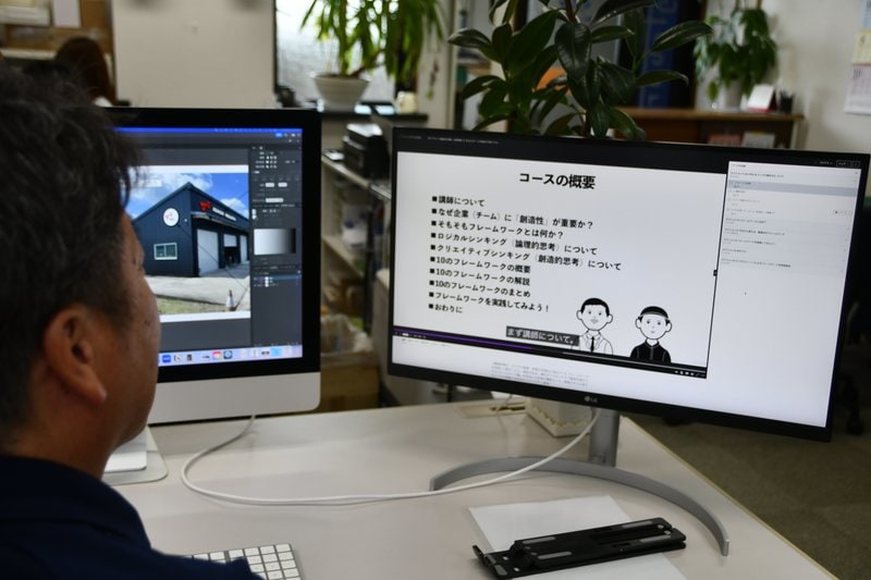 主に看板の要となるデザイン関係の講座を受講。LEDビジョンに流すための動画の作成方法も学習し、社業に生かしたという。これまでは、情報収集のために各地の講演会や研修会に足を運んでいたが「隙間時間にいつでもどこでも見ることができる。さらに種類が豊富で低価格なのもメリット」と強調する。