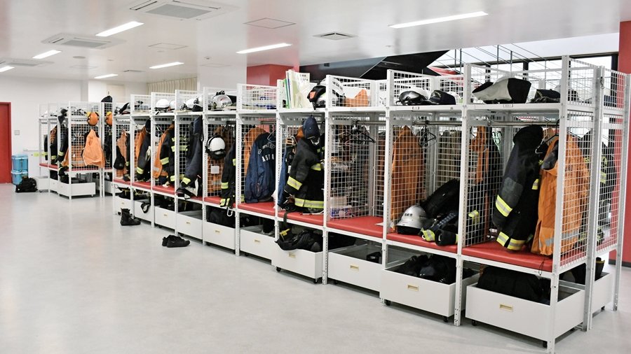益田市久城町の新庁舎には、2階建てアパートを模した県内消防本部では唯一の訓練塔や、見学デッキがある。36人分のロッカーを備えた出動準備室、個室の仮眠室を備える。女性専用エリアも新設し、女性職員の当直対応が可能になった。