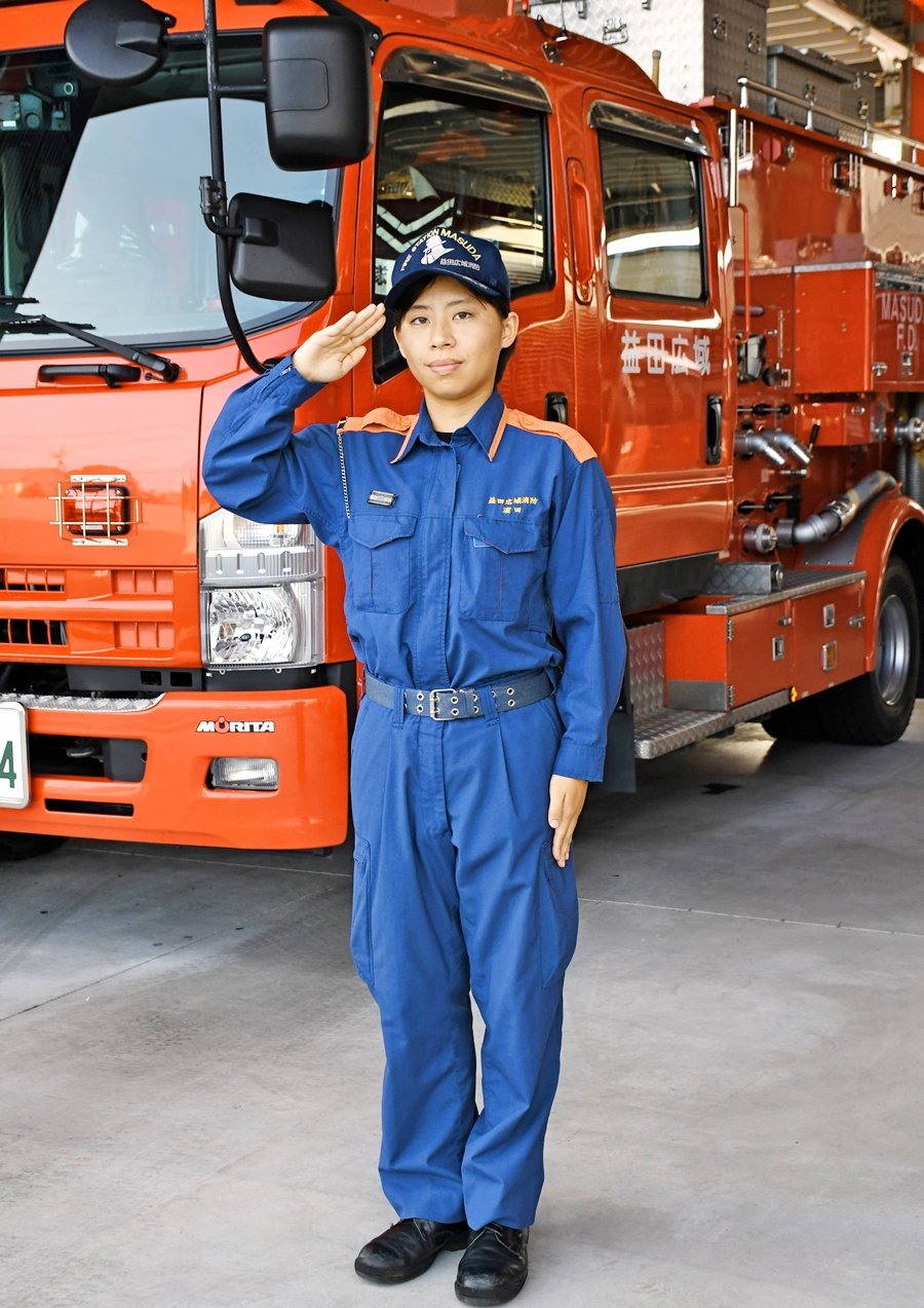 今回密着したのは、益田広域消防署の浜田海珠(うみ)さん(22)。島根県津和野町枕瀬の出身で、2021年から勤務する。