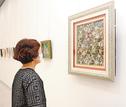 32人が花や風景、人物などがモチーフの洋画、日本画、絵はがき、写真などを基に、計120点を奥行きのある額に入れて並べた。はがき大から縦1メートル横80センチほどの大作もある。