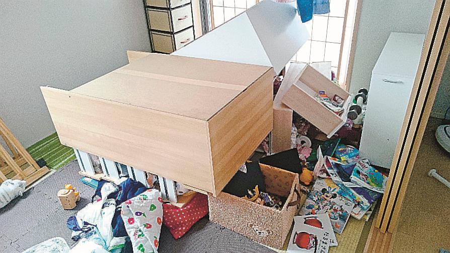 すぐにできる対策(たいさく)があります。寝(ね)たり、座(すわ)ったりする場所の周りを見てみましょう。背(せ)の高いタンスや棚(たな)はありませんか? もしあれば壁(かべ)に固定して、できるだけ上の方には重い物を置かないようにしてください。