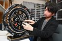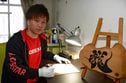 ガラス絵の制作は透明なガラスの裏に油絵の具で色を重ねる。絵の左右も、色を重ねる順も逆。輪郭から下地まで一つ一つ乾くまで待ち、時間をかけて仕上げる。