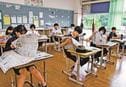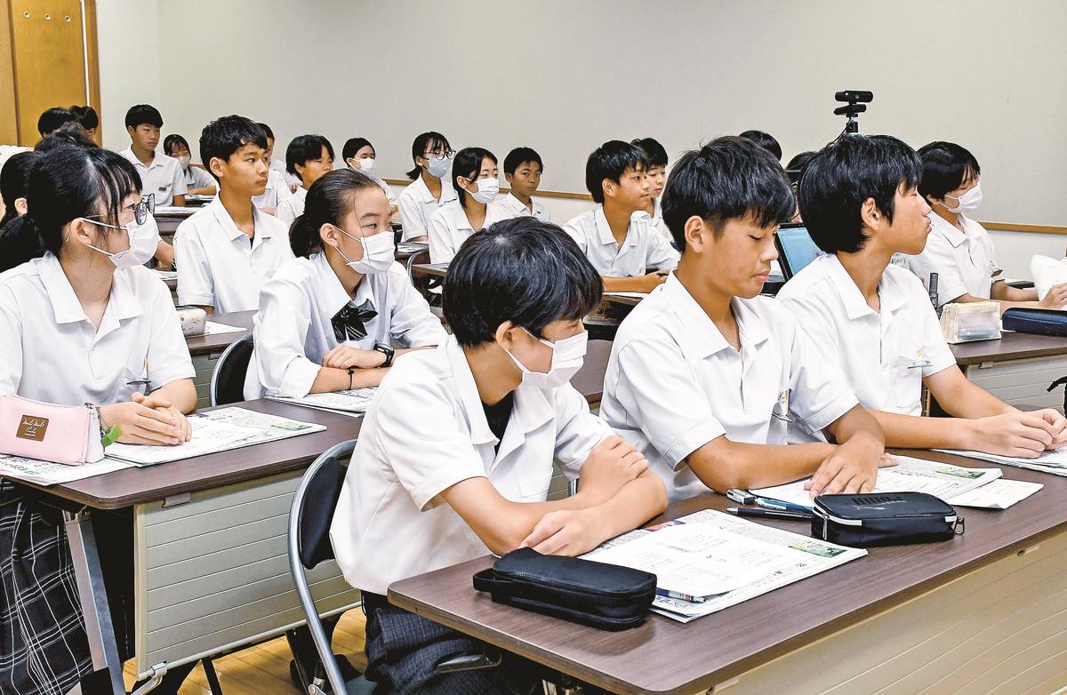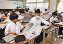 生徒は昨年も出前授業で新聞作りを学んでおり、今回は取材時にメモをしっかり取ることを意識しながら、山陰中央新報社の清水由紀子NIE担当の話を聞いた。下調べの大切さを教わり、見出しやリード、本文の役割、大事なことを先に書く「逆三角形」の文章構成をおさらい。読む人の目を引く見出しの付け方について説明を受けた。