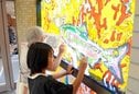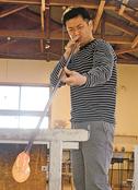 ガラス絵の制作は透明なガラスの裏に油絵の具で色を重ねる。絵の左右も、色を重ねる順も逆。輪郭から下地まで一つ一つ乾くまで待ち、時間をかけて仕上げる。