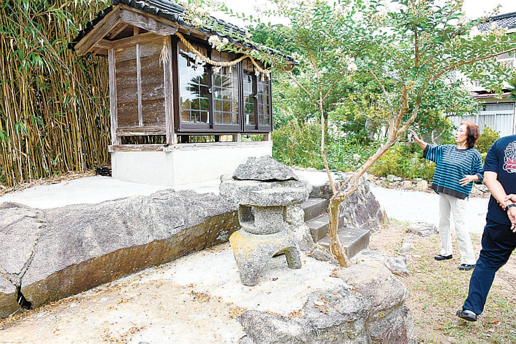 有名な伝承地は、産前に立ち寄った下府町の中村家に伝わる「腰掛け岩」だ。横幅2メートル近くある巨岩で、近くにほこらが建てられている。腰掛け岩を出発した式部は直後に出産。生湯町に産湯に使ったとされる井戸があり、地名の由来になった。