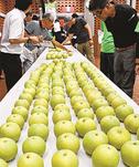 梨の表面には食用のイカスミ色素で「百年樹 長樹まちがい梨」の文字と梨の木のイラストが入る。板持さんは「長寿の木がある梨畑で実った梨を食べ、長生きしてほしい」と話した。