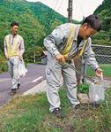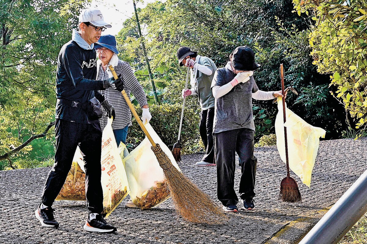 支部員10人がタオルで汗を拭いながら作業した。火ばさみで側溝の落ち葉を拾い集めたほか、石段で草取りをし、車道周辺では竹ぼうきを使って枯れ葉を掃き集め、ごみ袋に入れた。