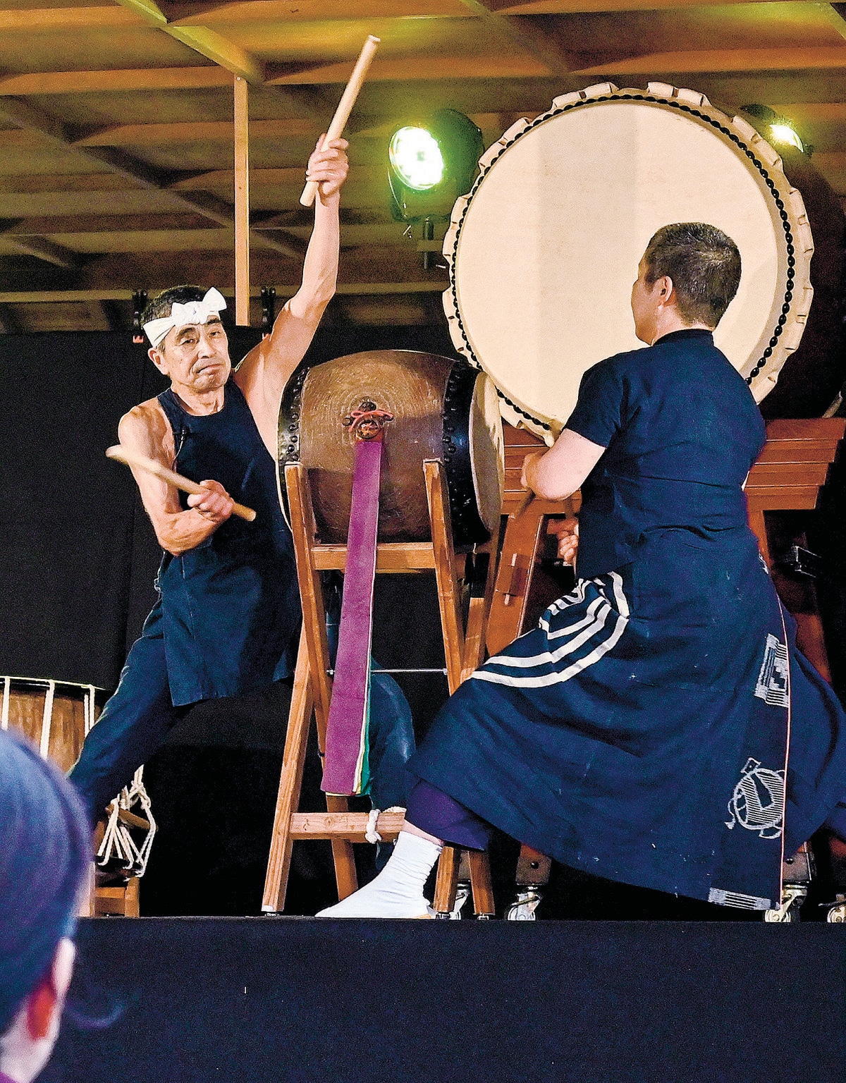 今福座は2005年以来の出演で、大小の太鼓としの笛の演奏に唄を絡めて8演目を披露した。五穀豊穣(ほうじょう)を祈った「田の神さんへ」は、田植えばやしのリズムを参考にしたという。太鼓を強弱つけて打ち鳴らすだけでなく、踊ったり、ばちを回したりするなど全身を使って表現した。