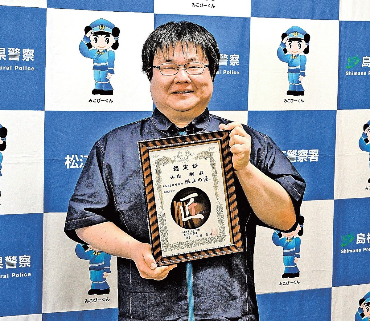 特殊詐欺ストッパーの名物店長が“新称号”を手にした。人気お笑いコンビ・かまいたちの山内健司さん(松江市出身)の弟で、ファミリーマート松江学園南店(松江市学園南1丁目)の山内剛店長(37)が24日、突出した実績が評価され松江署から「阻止の匠(たくみ)」に認定された。兄からはツッコミとともに「もらうからには頑張れ」と激励を受け、気を引き締めている。