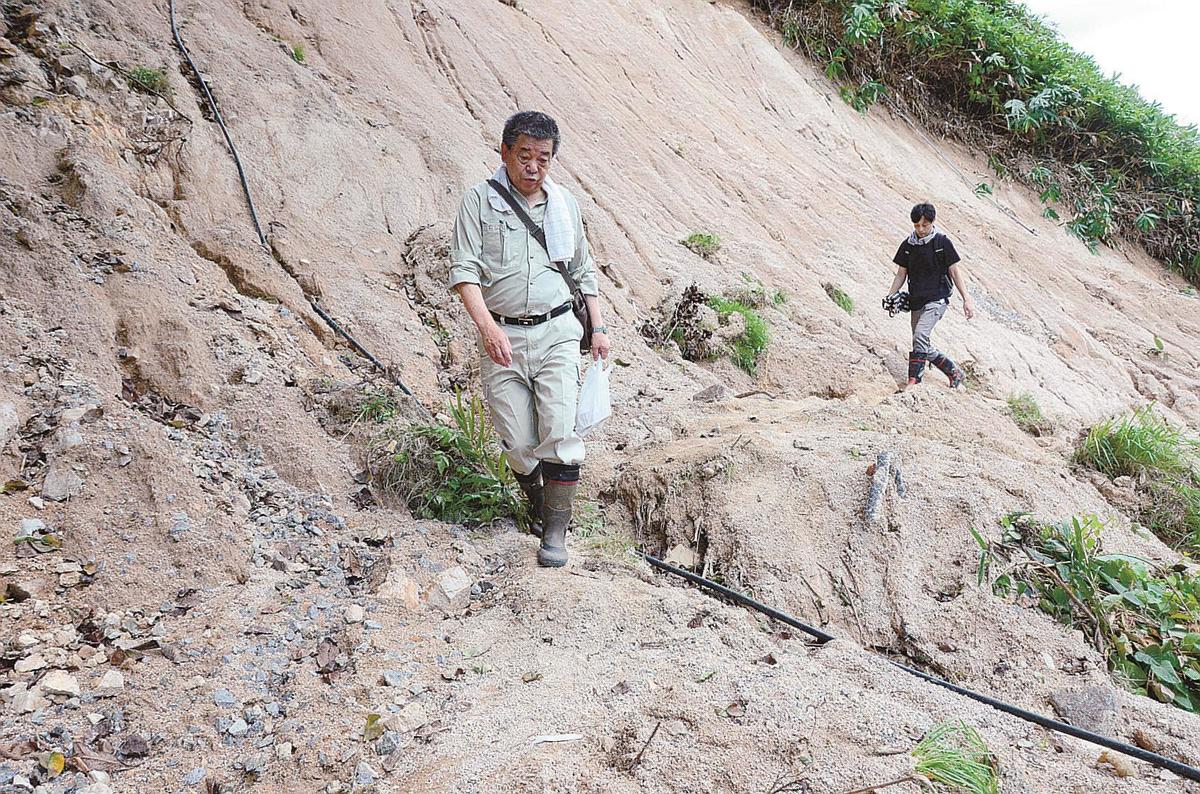 19日午前、出雲市境に近い鍋山地区で長靴姿の秦美幸(よしゆき)さん(79)=三刀屋町里坊=が首に掛けたタオルで汗を拭きながら、土砂に覆われた斜面を踏み外さないようゆっくりと歩みを進めた。