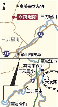 山陰両県を襲った記録的な豪雨から19日で1週間が経過した。広範囲で被害が発生した雲南市内は計55路線の県道と市道で通行止めが続き、三刀屋町鍋山地区では3世帯8人が孤立状態のままだ。住民は土砂崩れで崩落した道路跡を歩いて行き来し、不自由な生活を送る。 (清山遼太)