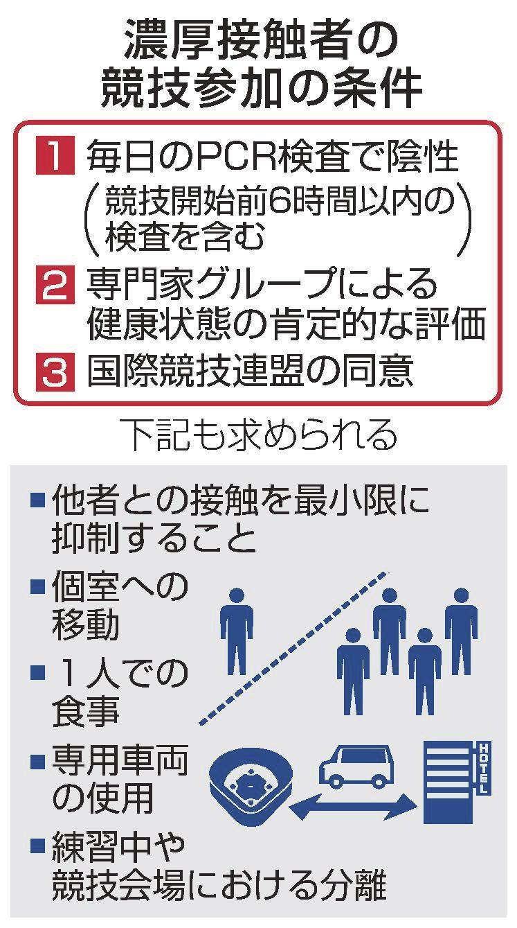 選手向けのコロナ対策の規則集「プレーブック」では、濃厚接触者の競技参加は、毎日のPCR検査で陰性となることや国際競技連盟の同意などが条件と規定している。今回、濃厚接触と確認された選手らには、個室への移動、1人での食事、専用車両の利用などを既に求めている。