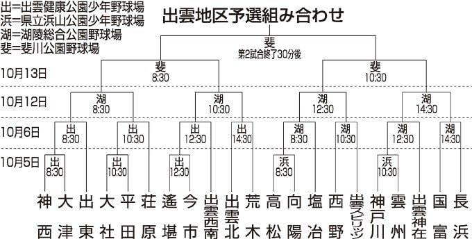JAカップ第41回島根県学童軟式野球選手権大会(県軟式野球連盟、山陰中央新報社主催、JAしまね、JA共済連島根特別協賛)の出雲地区予選が10月5、6の両日と、12、13の両日、出雲健康公園少年野球場(出雲市矢野町)などで開かれる。21チームが出場。優勝チームは11月2、3の両日、松江市営野球場(松江市上乃木10丁目)である県大会の出場権を得る。