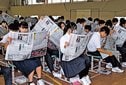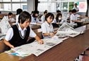 児童は、山陰中央新報社の清水由紀子NIE担当の説明を聞きながら、当日の山陰中央新報に目を通し、日々の出来事を記録する新聞の役割を確認。紙面での記事の位置や見出しの大きさでニュースの重要度が分かる特徴を理解した。