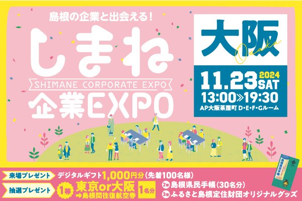 11月23日に大阪で開催される「しまね企業EXPO」は、島根県内の企業を知り、県内で働くことに対して具体的なイメージをもつきっかけになります。この機会にUターン就職の呼びかけをお願いします。