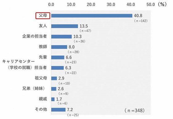 「父母」が40.8%と最も多く、次いで「友人」が13.5%、「企業の担当者」が10.3%と続いています。