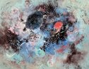 小藤包(しげる)代表の油彩画「夏の終り」は、夜空を背景に縦約1・2メートル、横約1・6メートルいっぱいに漁船を描き、迫力がある。水墨画の「備中吹屋」は雪が降る様子を描いた。水をはじく白抜き剤を筆先から細かく紙に落とすことで白い雪を表現したという。