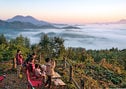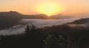 中世の武家・石見小笠原氏が円山(標高482メートル)の山頂に築いた丸山城(島根県川本町三原)の展望台では、午前6時過ぎに朝日が昇ると、雲海がオレンジ色に染まり、山々が雲間に浮かび上がった。