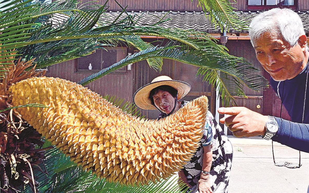 生きた化石とも称されるソテツは日本固有の常緑低木。一般的に10~15年に1度、花が咲くとされる。義父が47年前に植え、これまで兆候はなかったが、開花後は果実のような甘い香りを周囲に漂わせている。