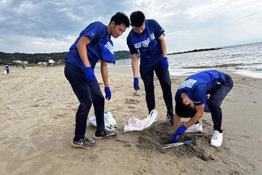 部活のユニフォームなどを身に着けた参加者たちがごみ拾いを開始すると、海水浴シーズンが終わり静けさが漂う海岸に、若者たちの活気が溢れました。キララビーチは、県内外からの海水浴客に人気の美しい海岸ですが、この日はたばこの吸い殻やペットボトルなどの生活ごみや、漁具などが落ちていました。