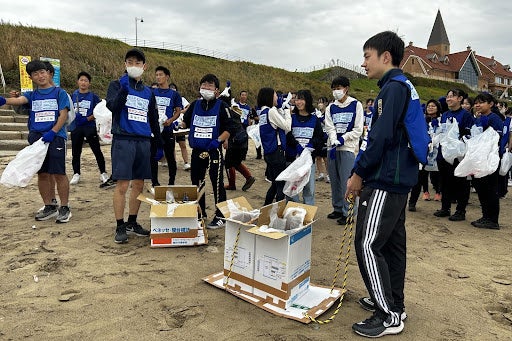 今回の大会は、5チームがオリジナルアイテムを製作して競技に挑みました。「Notポイ捨て、Let’sごみ拾い」とキャッチフレーズをあしらった箱やソリを付けた箱、細かく分別出来るように仕切られた箱など、それぞれが工夫を凝らしたアイテムです。参加者からは「少しでも海岸をきれいにしたい」「スポGOMIは楽しみながらごみが拾える」などの感想が聞かれました。40分間の競技が終了すると、全員で拾ったごみの総量は36.9kgとなりました。