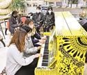 山崎さんは浜田PR大使で、所属事務所がある津市の後援会員が山崎さんとともに訪れた。2月発売の新曲は浜田市の魚や石見神楽が題材で、市民に振り付けを覚えてもらおうと企画した。
