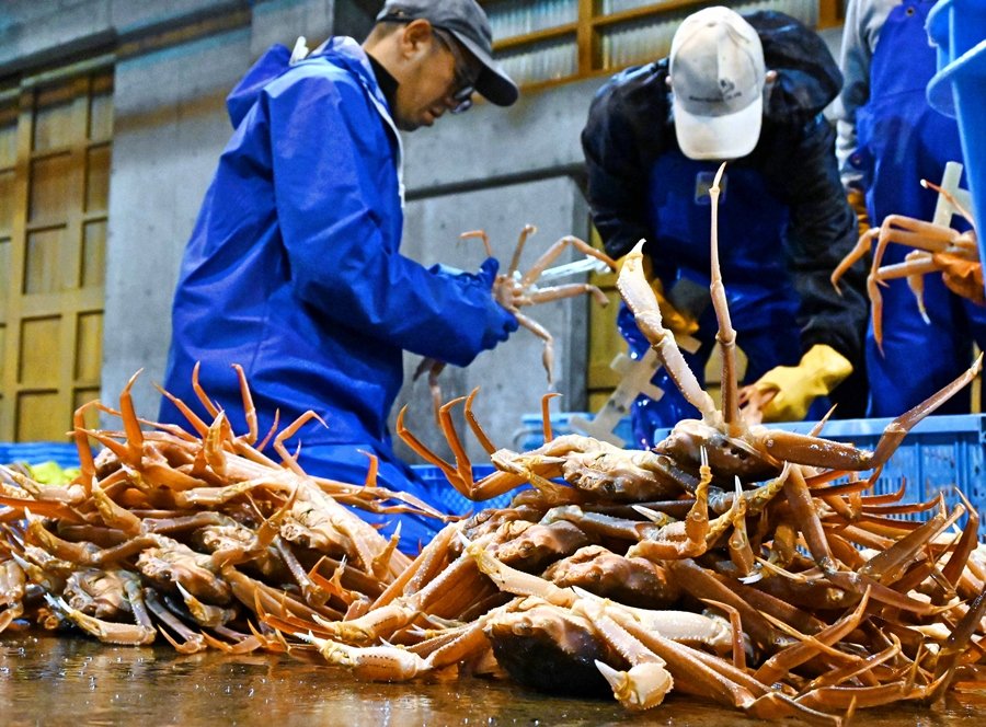 漁は6日に解禁され、鳥取市の鳥取港には、漁を終えた沖合底引き網漁船が次々に入港。関係者らがカニの大きさや色、重さ、身の付き具合を確認した。