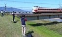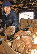 作品は高さ2・2メートル、幅2メートル。酒井清館長(75)ら住民有志6人が制作した。生け花の心得があるメンバーの助言を受け、中央に青竹、両側に赤と白に色を塗ったツタを配置した。青竹は島田の山々、白いツタは早朝の空を飛ぶコハクチョウ、赤いツタは朝日をイメージした。紅葉したニシキギと柿の実も置き、島田地区の「秋」を表した。