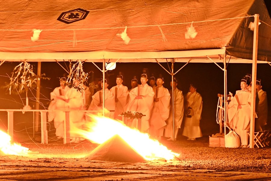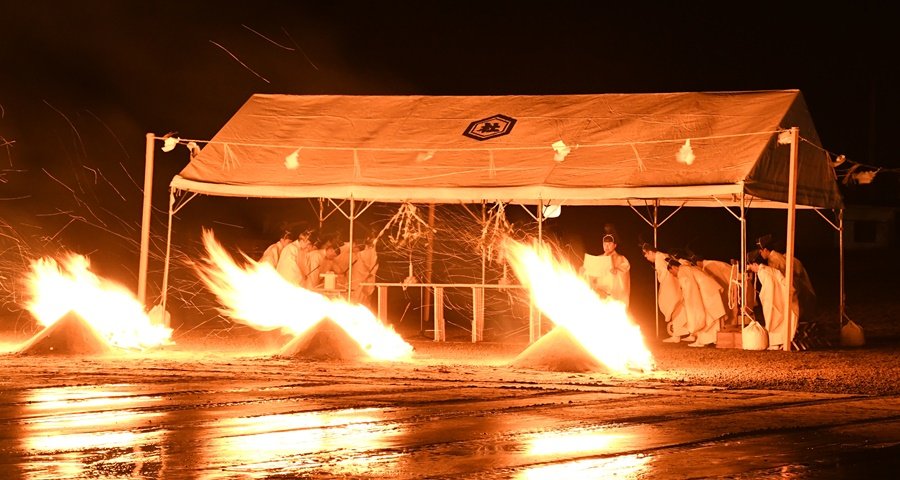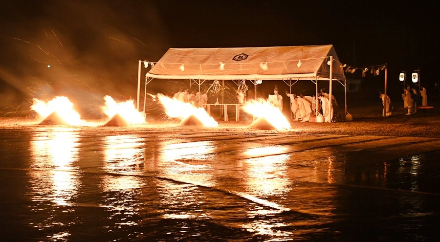 かがり火がたかれた砂浜で神職が祝詞を上げ、海から神々を迎えた。神職が神々の乗り移った「ひもろぎ」と呼ばれるサカキを絹垣で覆い、龍蛇神(りゅうじゃしん)を先頭に出雲大社へと歩みを進めた。