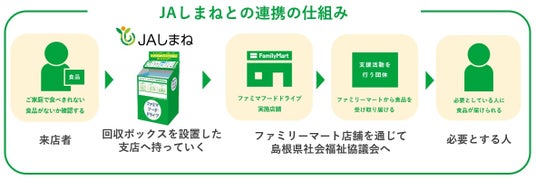 協業の取り組みとして今回は、ファミリーマートが地域における食支援と食品ロスの削減を目的に取り組むファミマフードドライブを活用し、「JAしまね」が運営する各支店でファミマフードドライブの回収ボックスを設置し、ご家庭にある食べきれない食品を各支店にお寄せいただきます。その後、集まった食品をJAしまねで取りまとめ近隣のファミマフードドライブを実施するファミリーマート店舗に持ち込み、協力パートナーである島根県社会福祉協議会を通じて、食支援が必要な方々にお届けする仕組みとなっています。