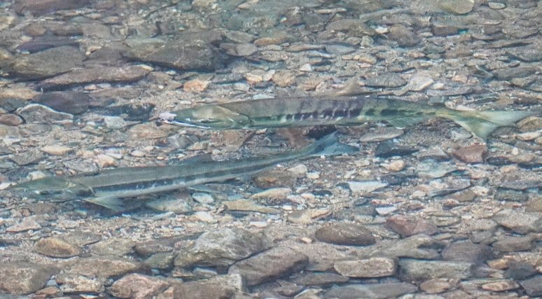 島根県川本町因原の濁川で14日、遡上(そじょう)したサケが今年初めて確認された。昨年より2日早く、例年より2週間程度遅い。今月いっぱい産卵行動をする姿が観察できるという。