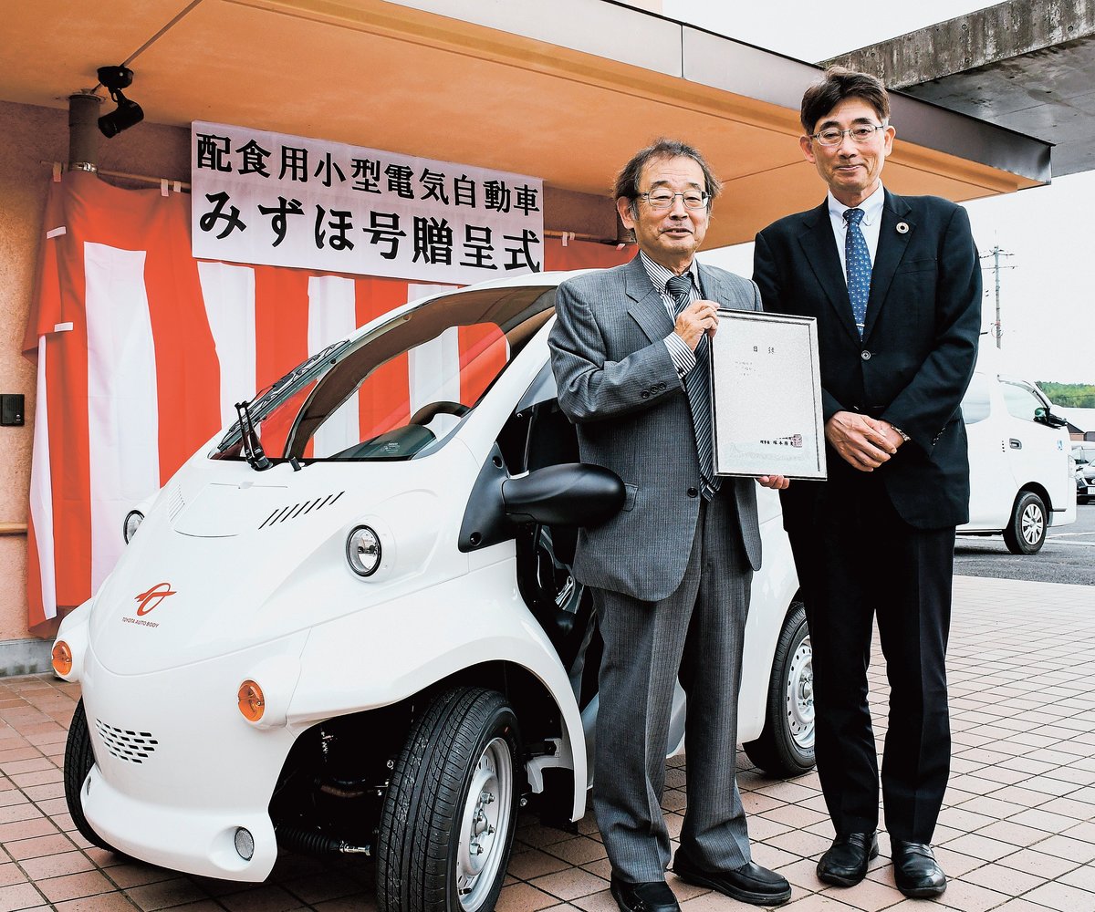 公益財団法人みずほ教育福祉財団(東京都千代田区)はこのほど、障がい者就労支援事業所エルパティオ三葉園(出雲市東郷町)に、配食用小型電気自動車1台を寄贈した。高齢者向けの昼食・夕食弁当の配達に活用する。