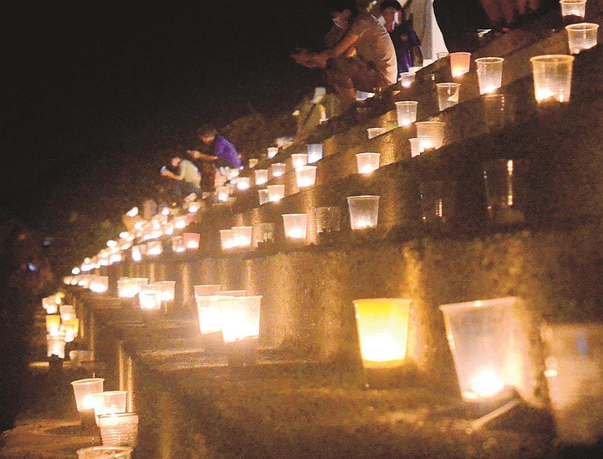 地元住民でつくる実行委員会が環境保全の啓発と地域活性化を目的に企画し、10回目。日が暮れて周囲が暗くなるのに合わせ、砂浜や護岸の階段に置いたろうそくに火をともした。