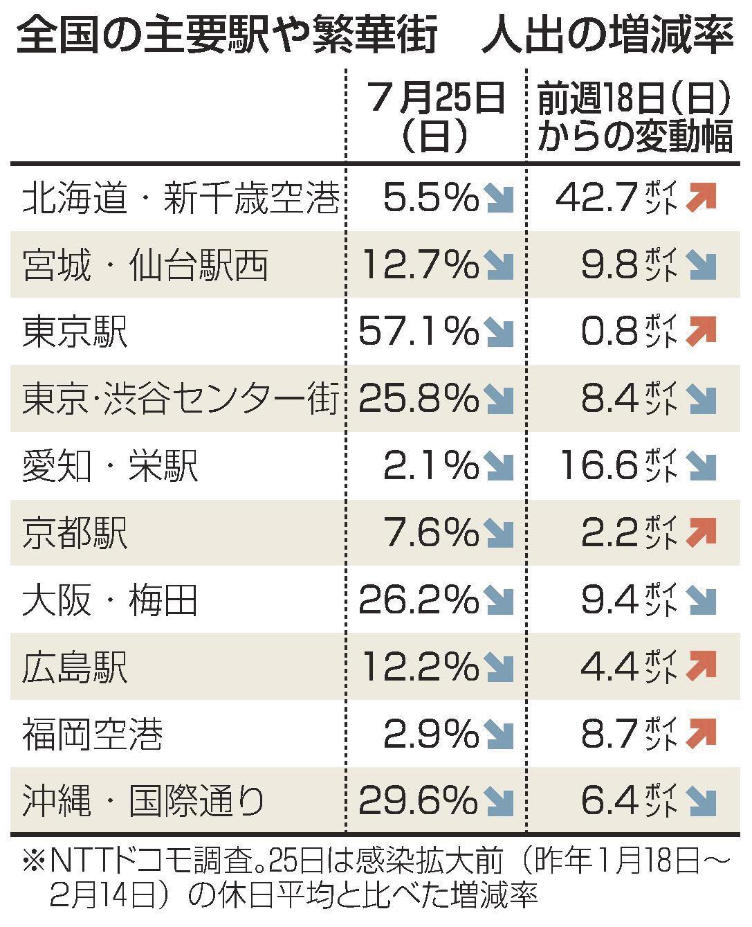 NTTドコモがまとめた25日午後3時時点の人出は、全国の主要駅や繁華街計95地点のうち8割近い75地点で前週日曜の18日から減った。24日から本格化した東京五輪の競技を自宅などでテレビ観戦する人が多かったもようだ。人出が増えたのは20地点だった。連休最終日に当たり、帰省や観光に伴う移動で、空港や駅の増加が目立った。